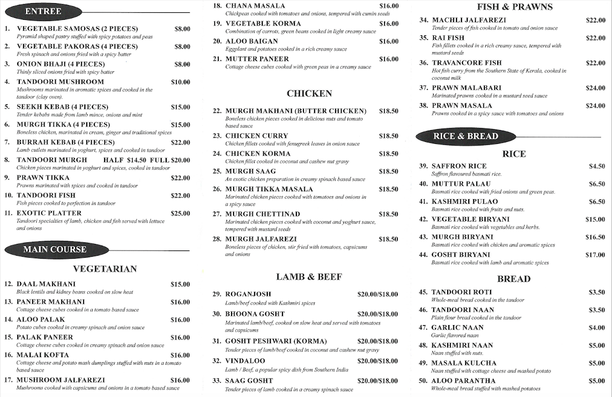 For those who enjoy lamb or beef, there are several mouthwatering choices available. The Rogan Josh, Bhoona Gosht, and Gosht Peshwari (Korma) are perfect for those seeking a rich, aromatic experience. The Vindaloo offers a fiery kick, while the Saag Gosht delivers a comforting combination of tender meat and savory spices.
