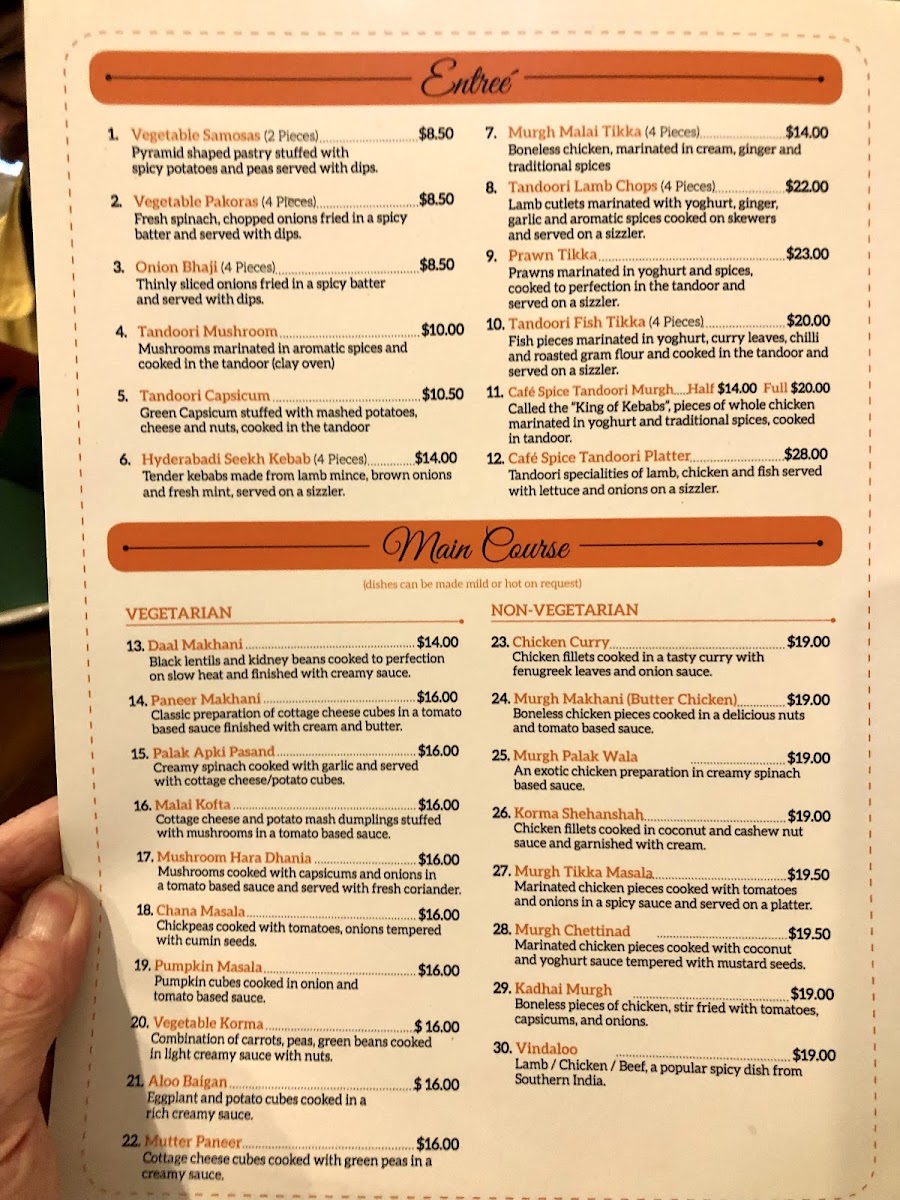 When it comes to the chicken dishes, Sanjeev's Cafe Spice doesn't disappoint. The menu features comforting options like Murgh Makhani (Butter Chicken), Chicken Curry, and Chicken Korma, along with the vibrant Murgh Saag and the popular Murgh Tikka Masala-all rich in flavor and sure to satisfy any chicken lover's cravings.